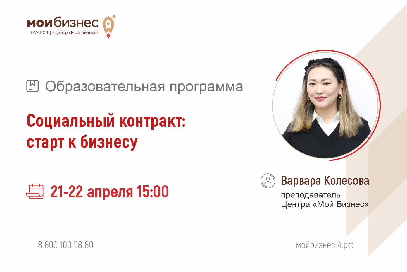 Региональный Центр «Мой бизнес» оказывает поддержку предпринимателям по национальному проекту «Эффективная и конкурентная экономика». Подробнее о мероприятиях, конкурсах, мерах государственной поддержки, выставках вы можете узнать на информационных ресурсах учреждения: Телеграм, ВКонтакте, Одноклассники, на портале Мойбизнес14.рф , а также по телефону горячей линии: 8(800)100-58-80.